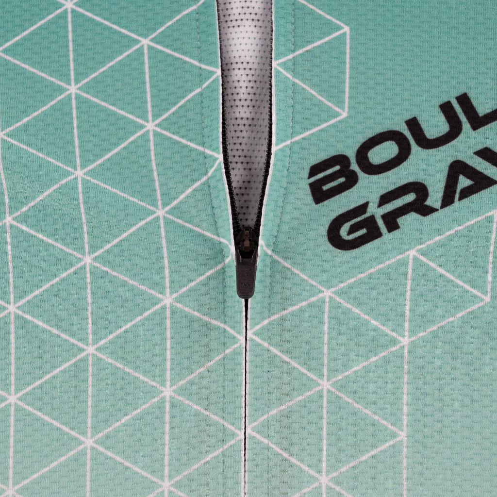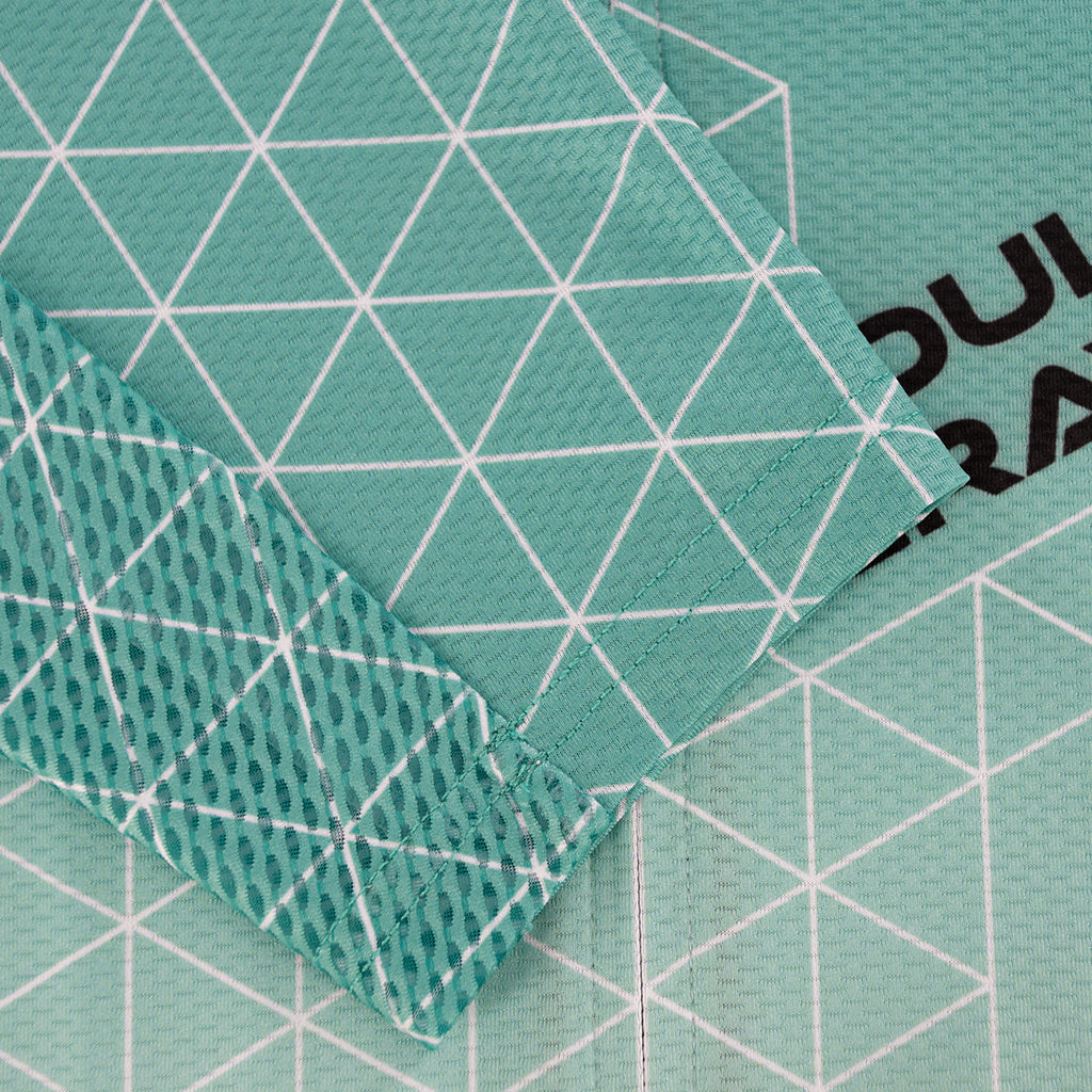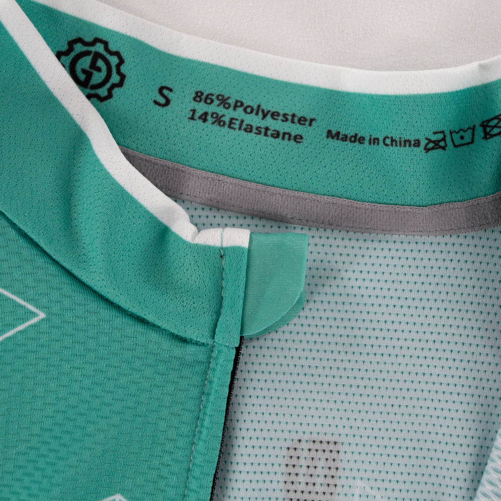 Our jersey is made of 4 light weight fabrics with excellent moisture wicking properties. Each fabric type also has a specify purpose and function. The front panel and shoulders fabric is more aerodynamic with a slick soft touch and tighter weave while still allowing moderate air pass for moisture wicking and ventilation. The back panel fabric offers high air pass for greater cooling while still providing excellent sun protection. The under arm panel fabric offers maximum ventilation and flexibility for rapid cooling and drying. The collar is constructed with soft touch fabric with zipper flap to minimize irritation and maximize comfort. The arm cuffs are made of the same soft touch fabric and are designed to rest flat against the arm without elastic or grippers to increase aerodynamics.
